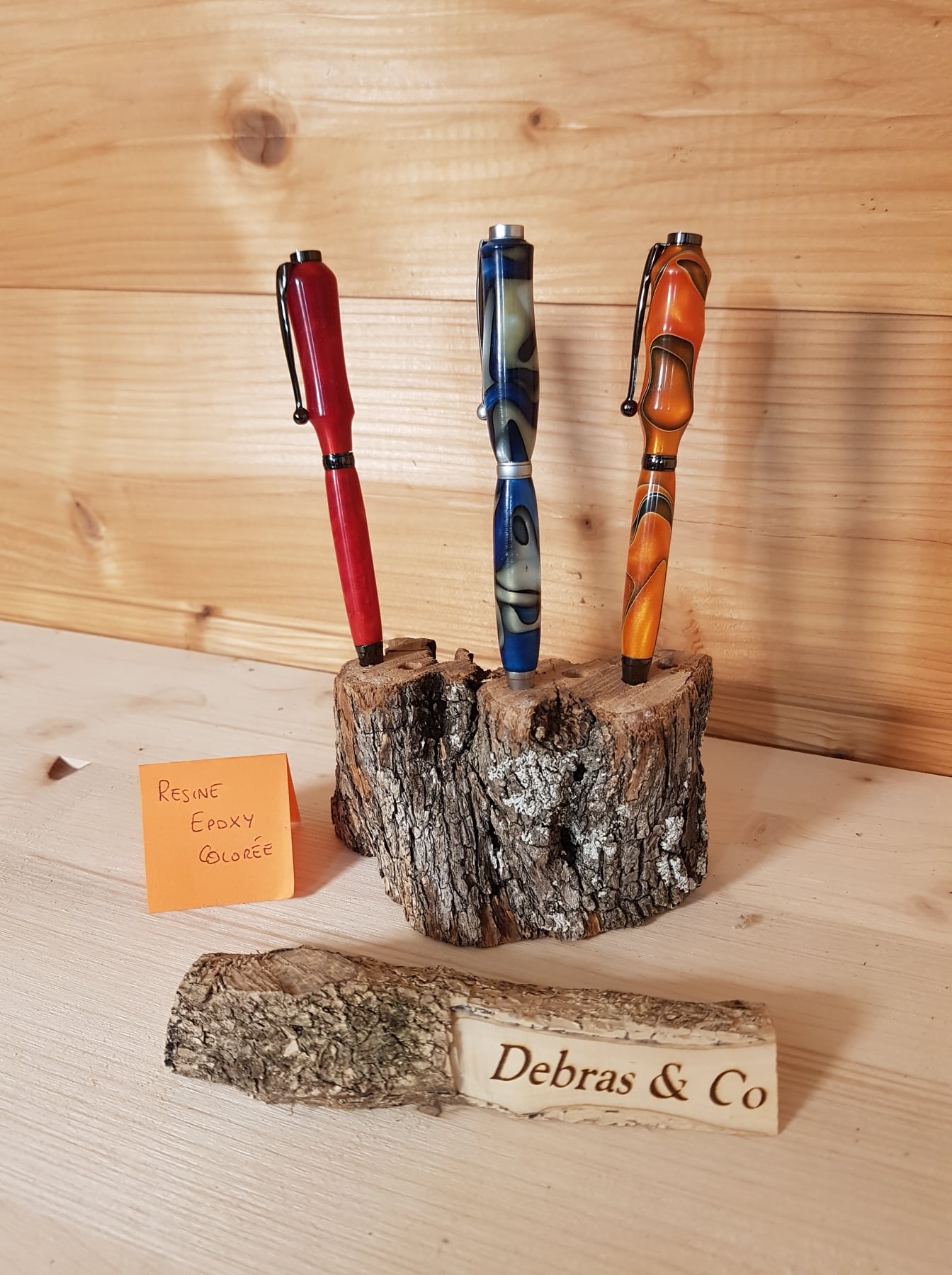 Stylo en résine époxy, couleur mécanisme au choix, encre rechargeable noire. Finition lustrée. Remis en étui velours noir.